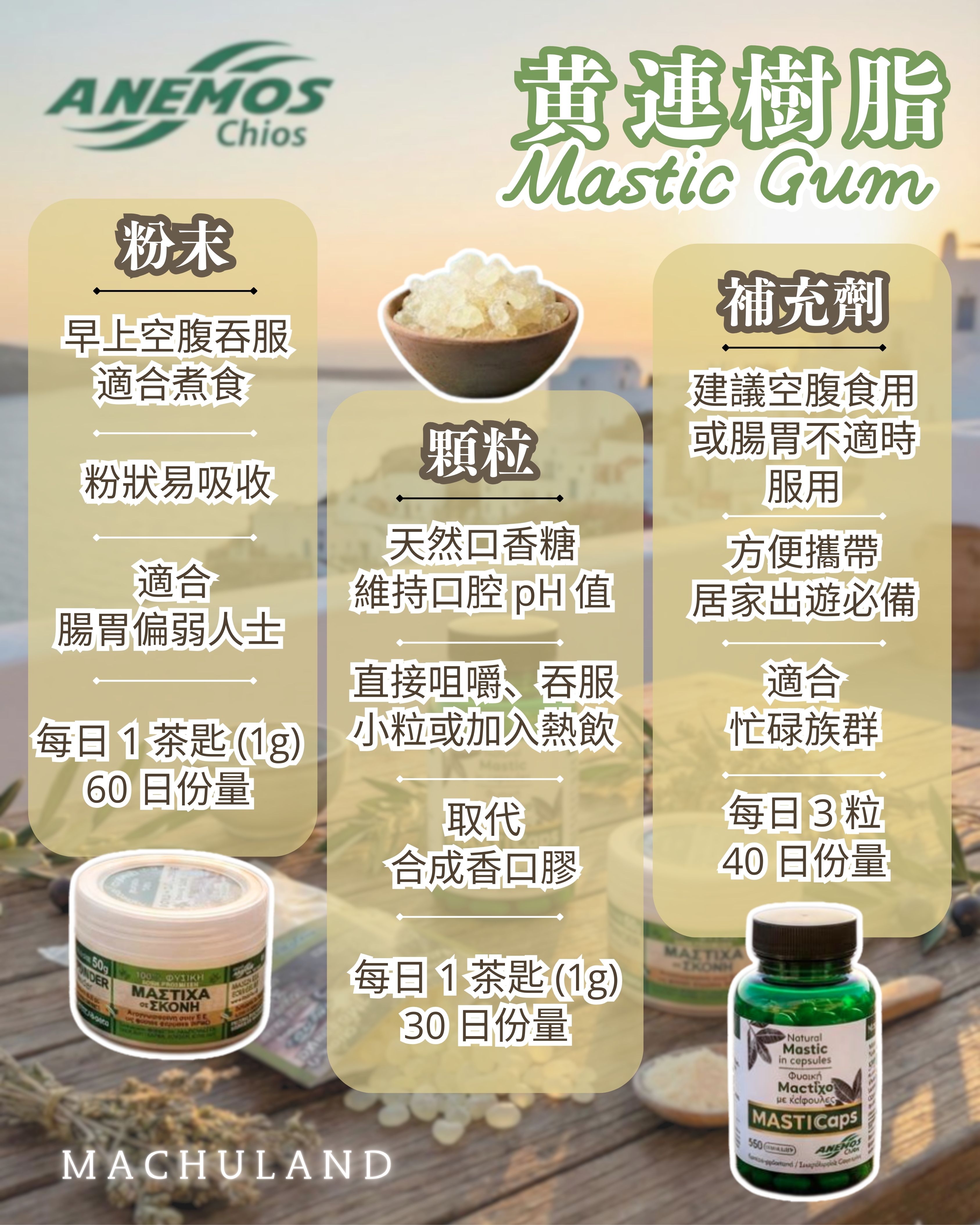 Mastic Gum含有來自黃連樹(Pistacia lentiscus)的天然樹脂,也稱為mastiha樹,一種主要在希臘生長的灌木狀樹。由含有精油的樹脂滲出物組成,黃連樹脂已經被傳統醫師用於緩解胃痛幾個世紀。Mastic Gum有助於胃和十二指腸細胞和組織的健康,以及維持健康的胃酸生產水平,更有效預防大腸癌。