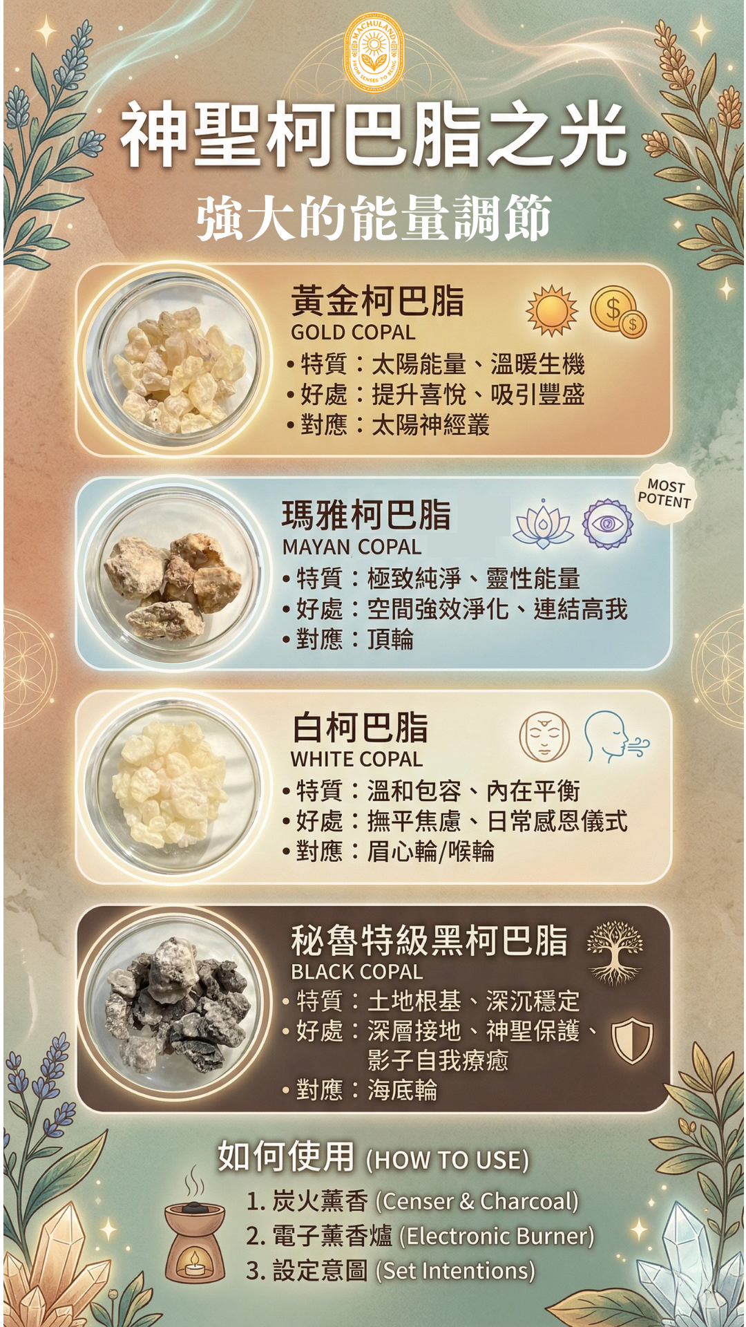 柯巴脂(Copal)是一種源自美洲古文明的神聖天然樹脂,被譽為「大地的血液」。在 2026 年的整全療法中,它不僅是薰香,更是強大的生物能量調節劑。Copal 具備比一般植物(如白鼠尾草)更快速且深層的頻率轉換能力,特別針對「驚嚇、悲慟、沮喪」等情緒創傷提供修復。透過金、白、瑪雅、黑四種不同頻率的柯巴脂,能有效清除空間負能量、強化個人氣場,並引導意識進入深層冥想狀態。