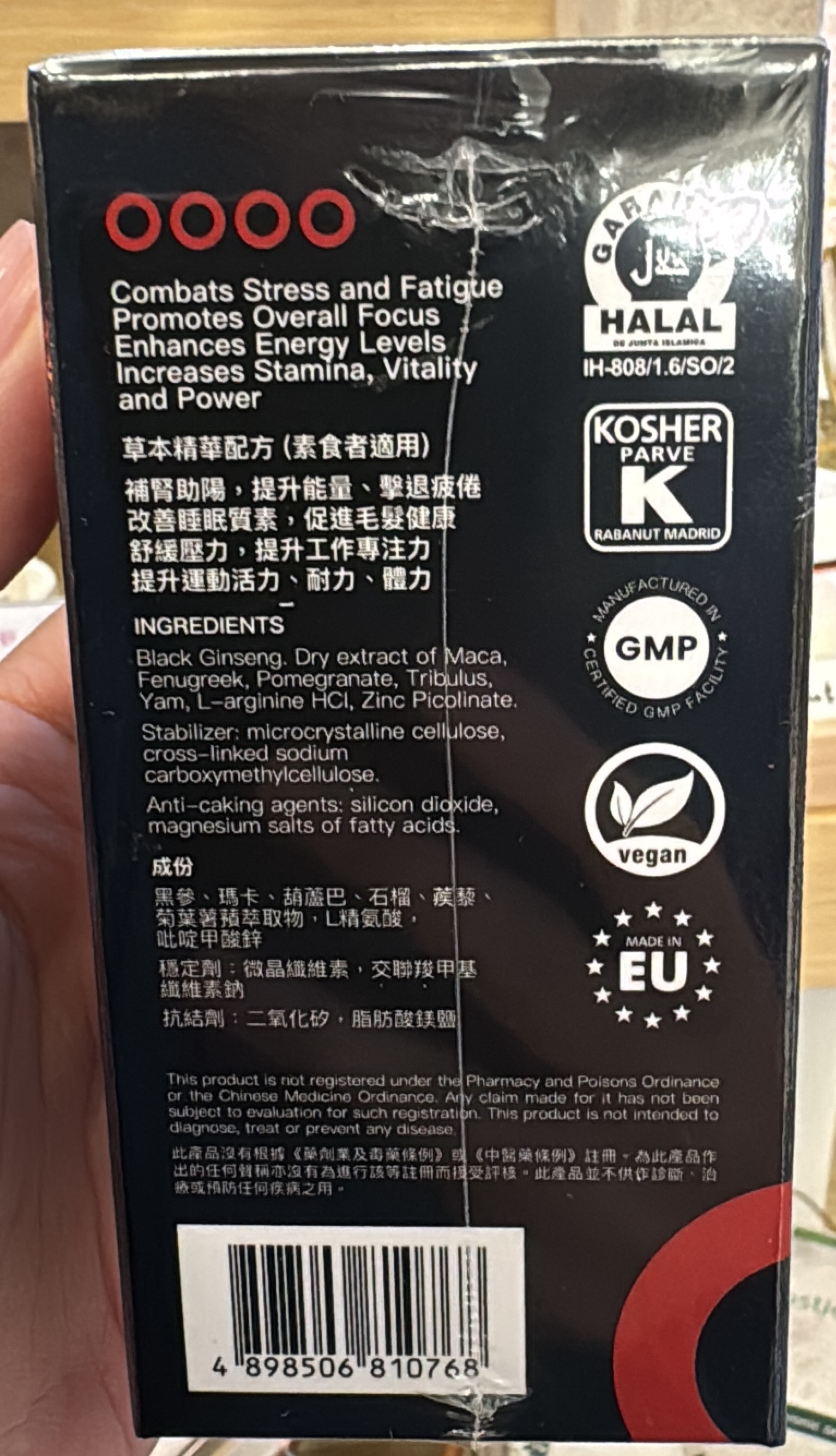 黑人參、瑪卡、葫蘆巴、石榴、刺藜、菊葉薯蕷萃取物,L精氨酸,吡啶甲酸鋅;穩定劑:微晶纖維素,交聯羧甲基纖維素鈉;抗結劑:二氧化矽,脂肪酸鎂鹽