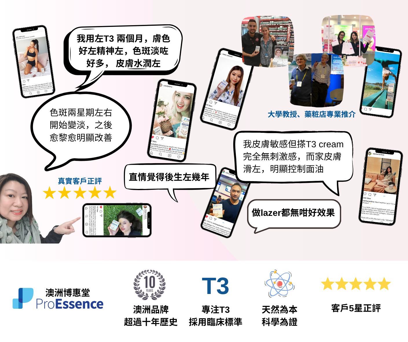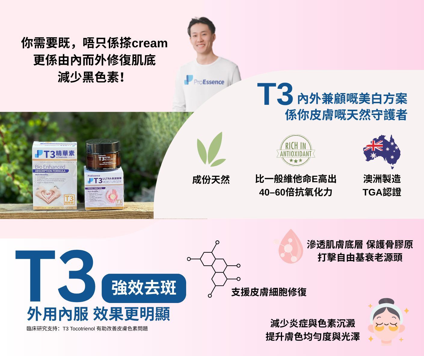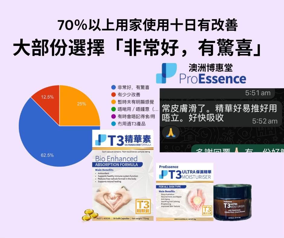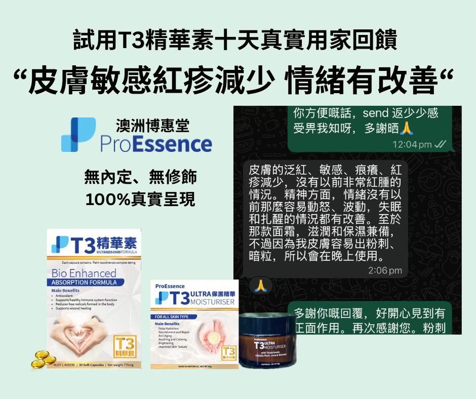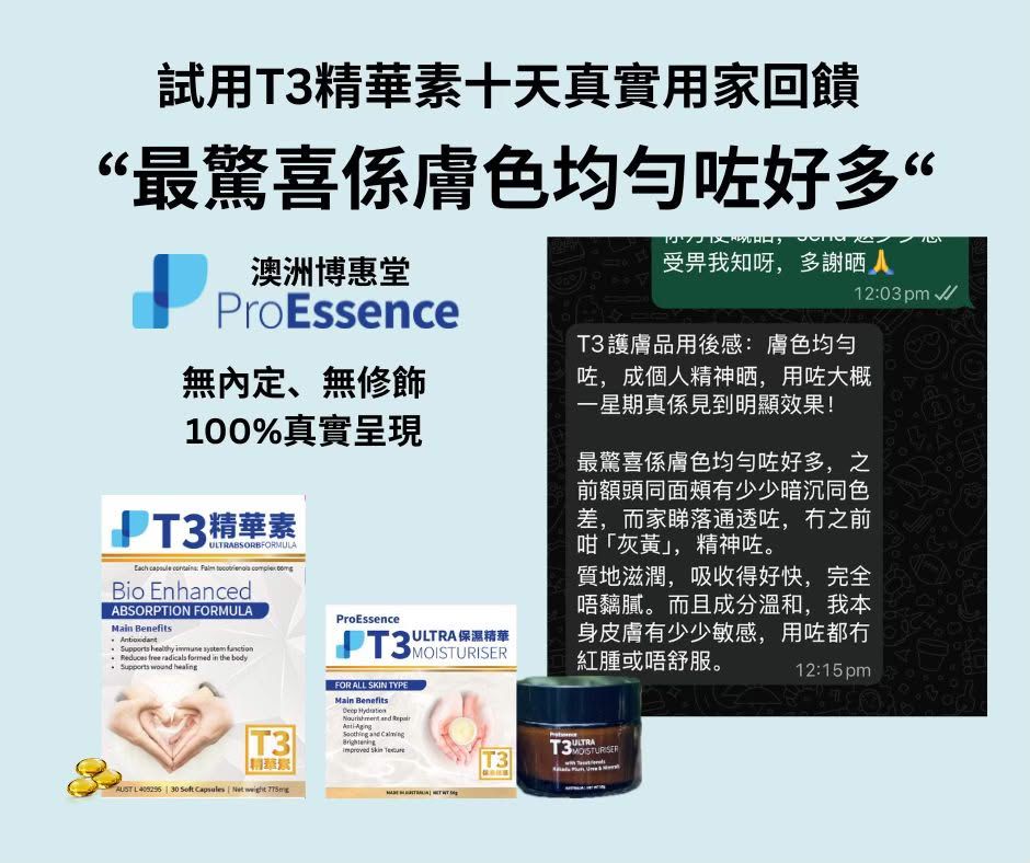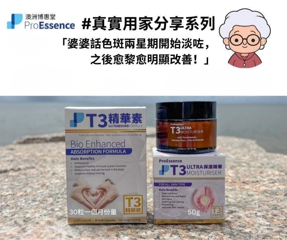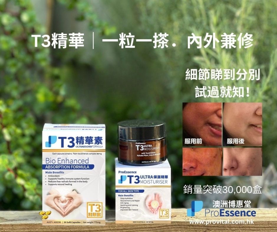 本產品含有有大自然最強抗氧化劑T3 Tocotreinols生育三烯酚,並添加了澳洲天然維他命C之王的卡卡杜李(Kakadu Plum)精華,這款創新配方專為修復及保護肌膚而設。T3 Ultra保濕精華 能有效提高皮膚彈性和緊致度、改善色斑,亮澤肌膚、軟化皮膚,改善細紋及促進皮膚膠原蛋白生成。